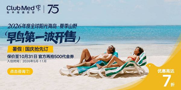 Club Med地中海俱乐部2026年夏季度假产品(2026年5月至11月)预售已开启,宾客可提前锁定心仪出行日期与房型,从容规划与家人亲友的自在阳光假期。前往“Club Med官方预订”小程序,享受早鸟专属礼遇,提前锁定下一季精彩旅程。